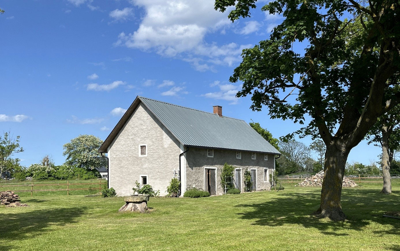 Här ser du en bild på mitt vackra kalkstenshus på tomten i Alböke.